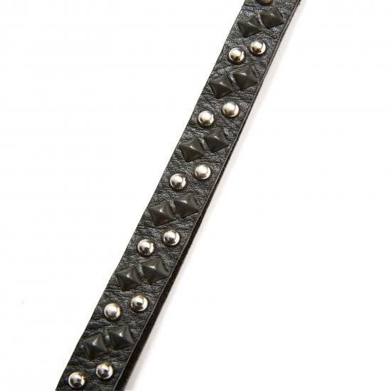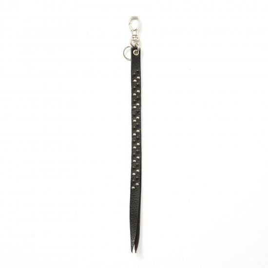 スタッズレザーで作製されたロングタイプキーリング。ラウンド型とピラミッド型ブラックスタッズを配した。裏側にもブランドネームの刻印が入る。