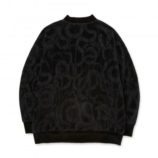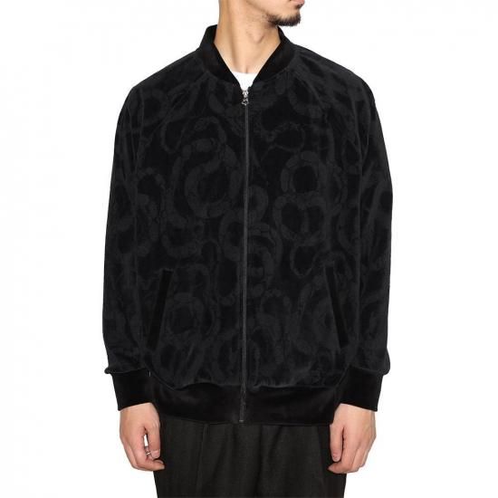 ジャガード総柄ベロアリブジャケット。定番のスネーク柄をジャガード織りにて表現した肉厚なベロア生地を採用。生地の工程全て国内工場で行っている。襟、袖口、裾、ポケット口は無地ベロアで切り替え。