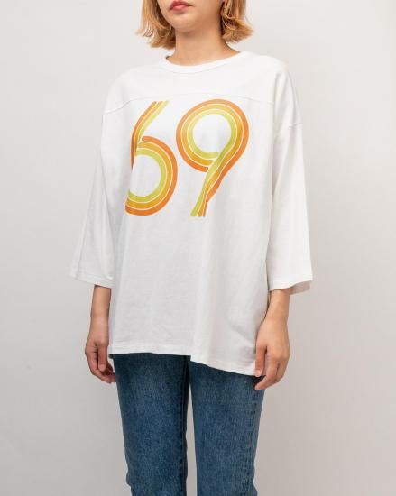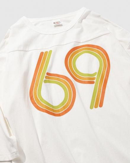 ウッドストックフェスティバルが開催された69年をナンバリングしたフットボールでTシャツす。